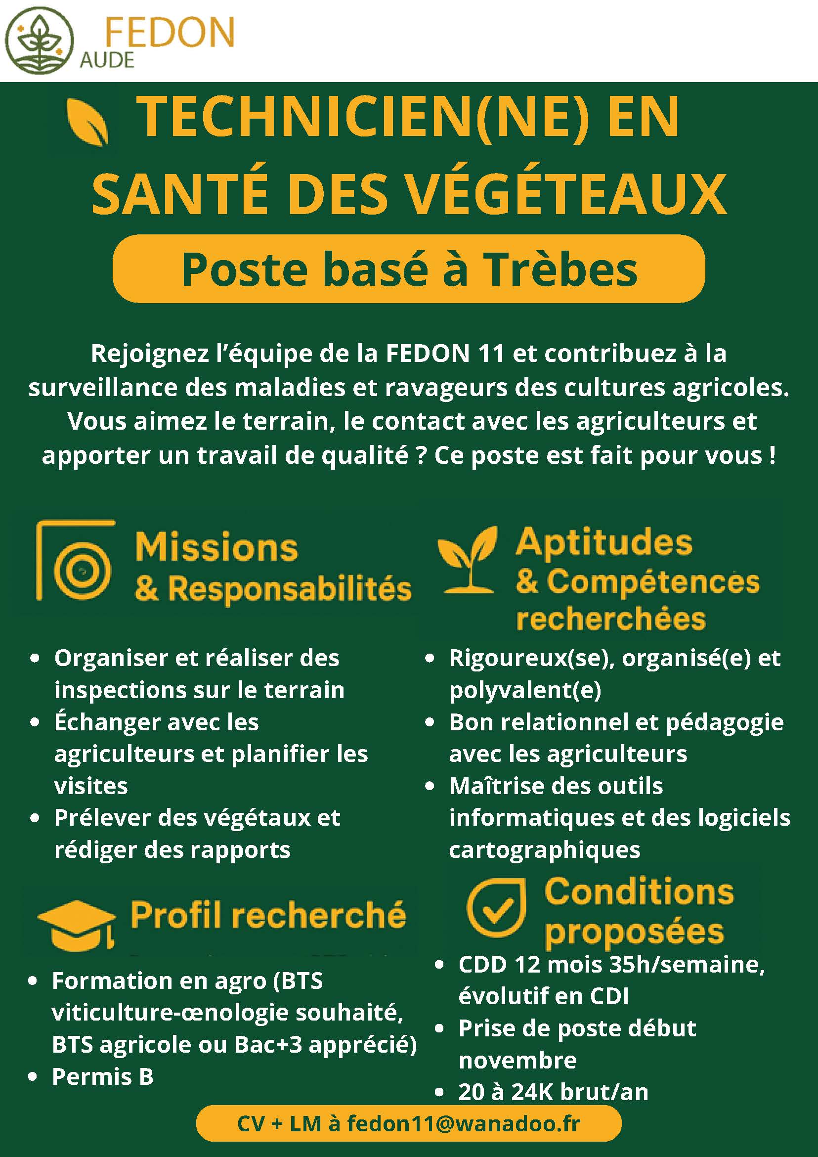 Vous êtes ici : Accueil1 / Actualités FREDON2 / [EMPLOI] La FEDON 11 recrute, regoignez-nous !