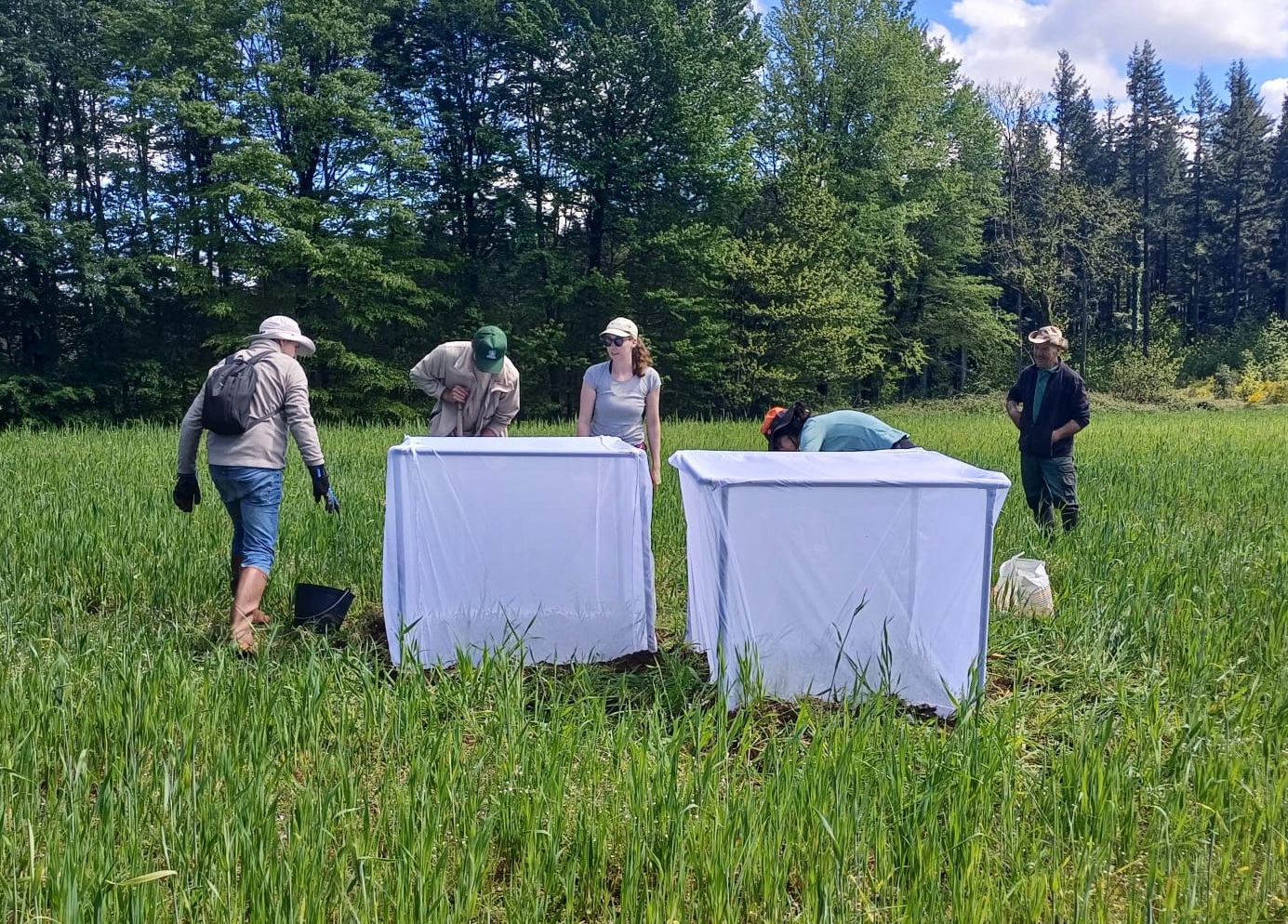 Les chrysomèles sont lâchées sous cages sur la moitié des sites, sans cages sur l’autre moitié (150 insectes pour chaque lâcher). Les cages permettent de s’assurer que les adultes vont pondre avant de se déplacer ; elles sont enlevées au bout d’une semaine.