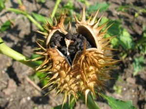 Les fruits forment des bogues épineuses de 4 à 5 cm. Chacune contient environ 500 graines de 3 mm, plates, de couleur noir. Chaque pied de datura peut porter jusqu’à une centaine de capsules dont la déhiscence est échelonnée dans le temps.