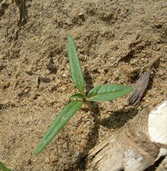 Au stade plantule, les cotylédons sont grands et lancéolés. La tige et les pétioles sont pileux. Les feuilles alternes. Quel que soit le stade, une odeur désagréable, proche de celle du sureau, se dégage au toucher.