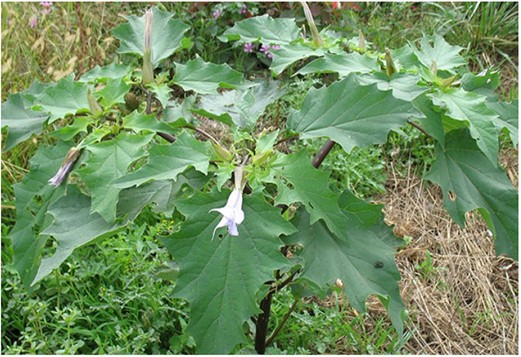 Le datura stramoine est une plante annuelle invasive de la famille des solanacées. Elle contient des alcaloïdes tropaniques – très toxiques pour l’homme et les mammifères – dans l’ensemble de la plante et surtout dans les graines.