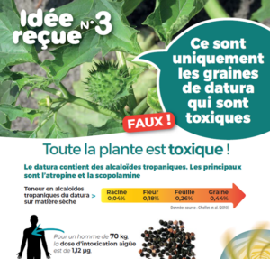 Découvrez ce un petit guide sur 10 idées reçues sur le datura publié par Arvalis – institut technique agricole . Par sa vocation, il est plutôt destiné aux agriculteurs, mais il y a des informations très intéressantes pour tous… justement, à votre avis, la plante concerne-t-elle seulement les agriculteurs ? NON bien sûr ! et est-ce que les graines seulement sont toxiques ? …découvrez toutes les réponses dans ce petit fascicule qui permet d’en savoir beaucoup plus sur cette redoutable plante – à arracher avec des gants si vous la rencontrez.