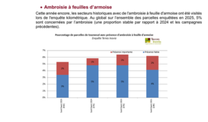Cette année encore, les secteurs historiques avec de l’ambroisie à feuille d’armoise ont été visités lors de l’enquête kilométrique*. Au global sur l’ensemble des parcelles enquêtées en 2025, 5% sont concernées par l’ambroisie (une proportion stable par rapport à 2024 et les campagnes précédentes).